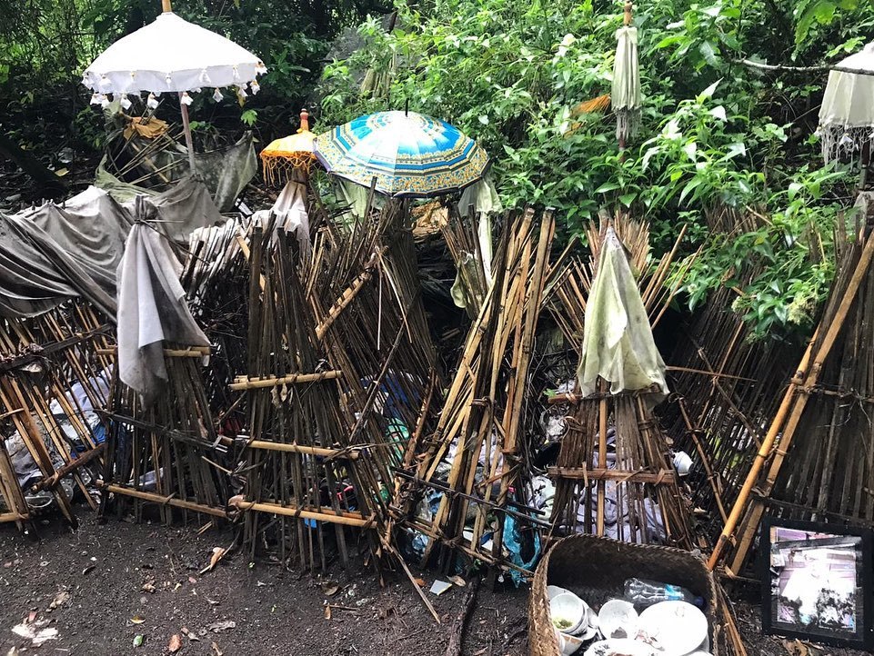 Foto : jenazah yg diletakkan diatas tanah dan hanya ditutup bambu bentuk kerucut, namun walaupun jenazah dalam proses pembusukan anehnya bau busuk itu diserap oleh akar pohon Taru menyan yang ajaib