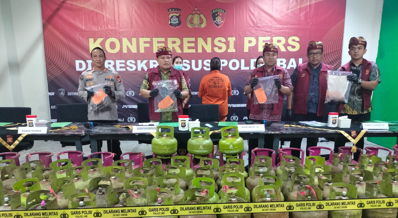 Dirreskrimsus Polda Bali Kombes Pol Teguh Widodo S.I.K., M.M., bersama Kabidhumas Kombes Pol Ariasandhy S.I.K., didampingi Kasubdit 4, membenarkan adanya pengungkapan pengoplosan gas LPG 3 KG subsidi pemerintah, selasa 30/9/2025.