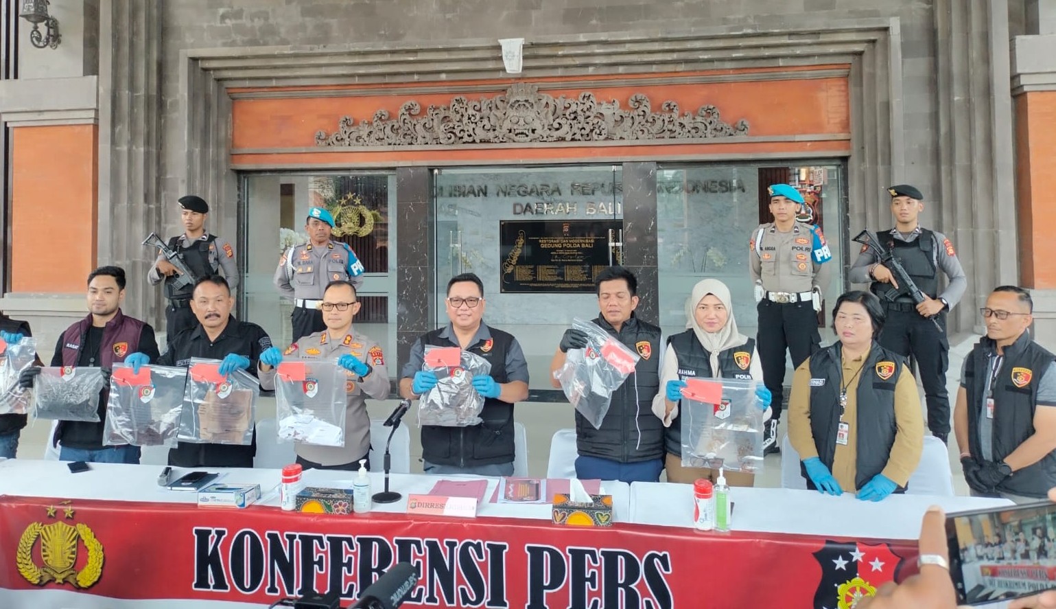 Direskrimum Polda Bali Kombes Pol Dr. I Gede Adhi Mulyawarman S.I.K., S.H., M.H., Kapolres Badung AKBP Josef E Purba S.I.K., beserta jajaran Jatanras dan Kasubid PID mewakili Kabid Humas, didepan para awak media menyampaikan perkembangan kasus pembunuhan WNA asal Belanda, sabtu 28/3/2028.